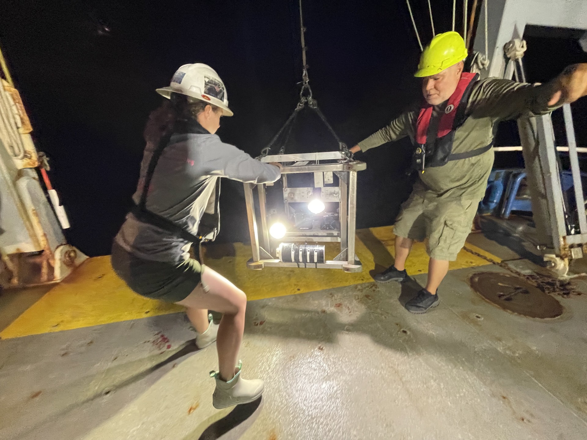 Expedition members recover SharkCam, a baited video camera with lights, after a night deployment during the Northeast Canyons and Seamounts Marine National Monument Expedition, 2024.