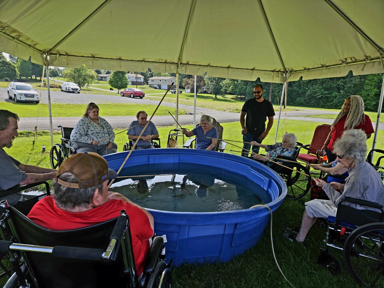 Residents of Fair Oaks Health & Rehabilitation enjoying the annual fishing event provided by Wolf Creek National Fish Hatchery.