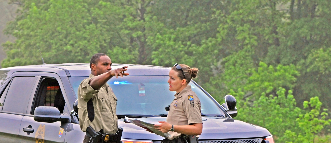 Federal Wildlife Officer Gabe Harper (before he moved to the Office of Law Enforcement in the late 2010s) and National Wildlife Refuge System law enforcement branch chief of field support and policy Samantha Fleming at Patuxent Research Refuge in Maryland in May 2015.