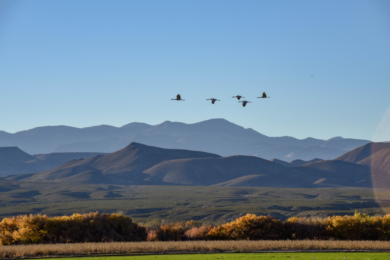 Festival of the Cranes at Bosque del Apache National Wildlife Refuge 2016 Sandhill Cranes flying over the Refuge from a distance.