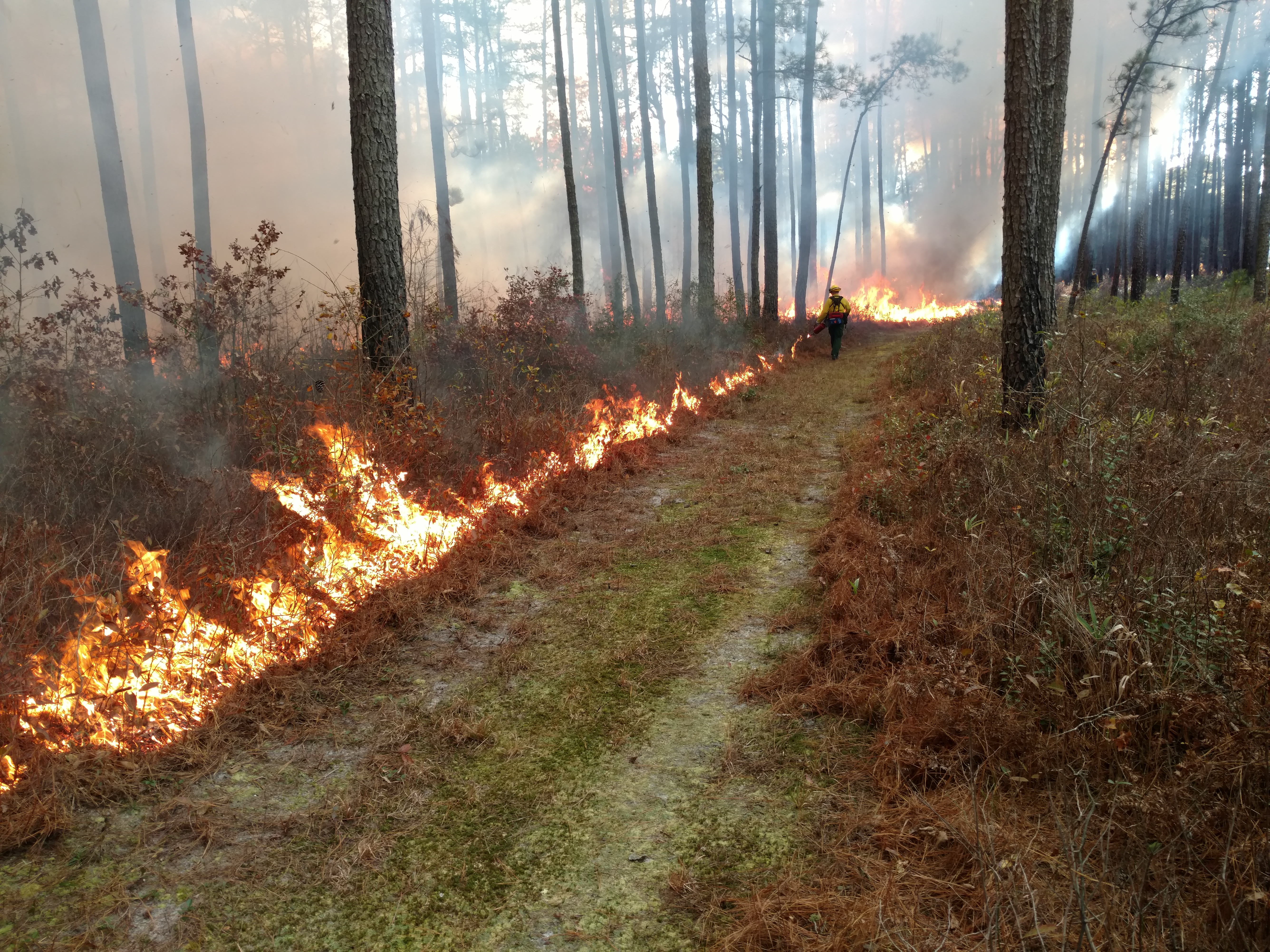 Fire personnel igniting backing fire for prescribed burn in longleaf pine habitat at Zuni Pine Barrens in Isle of Wight County, Virginia with partner agencies