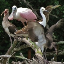 Five large birds of different species mingle on woody debris at Cedar Keys National Wildlife Refuge in Florida.