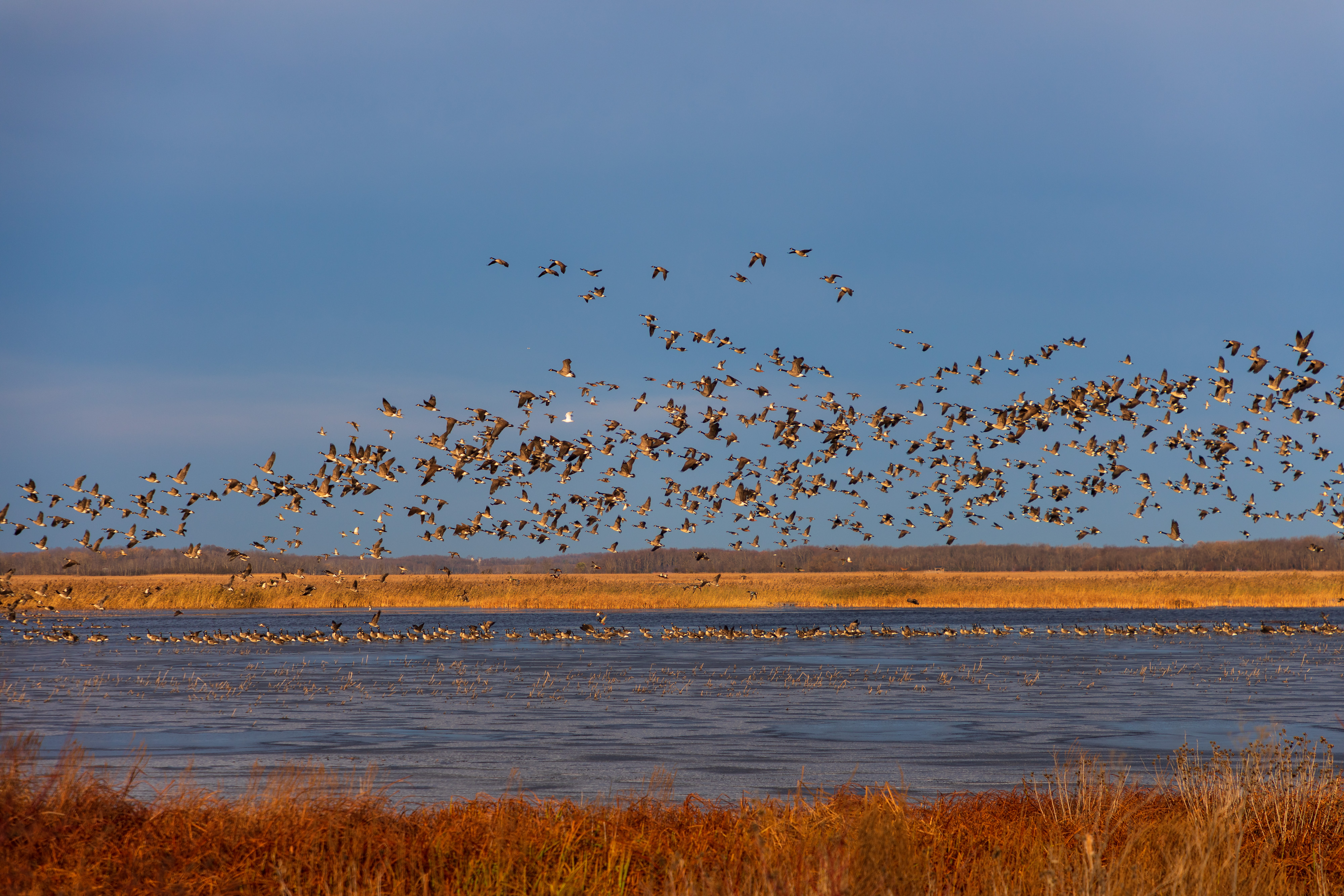 A flock of waterfowl lifts from the Main Pool.