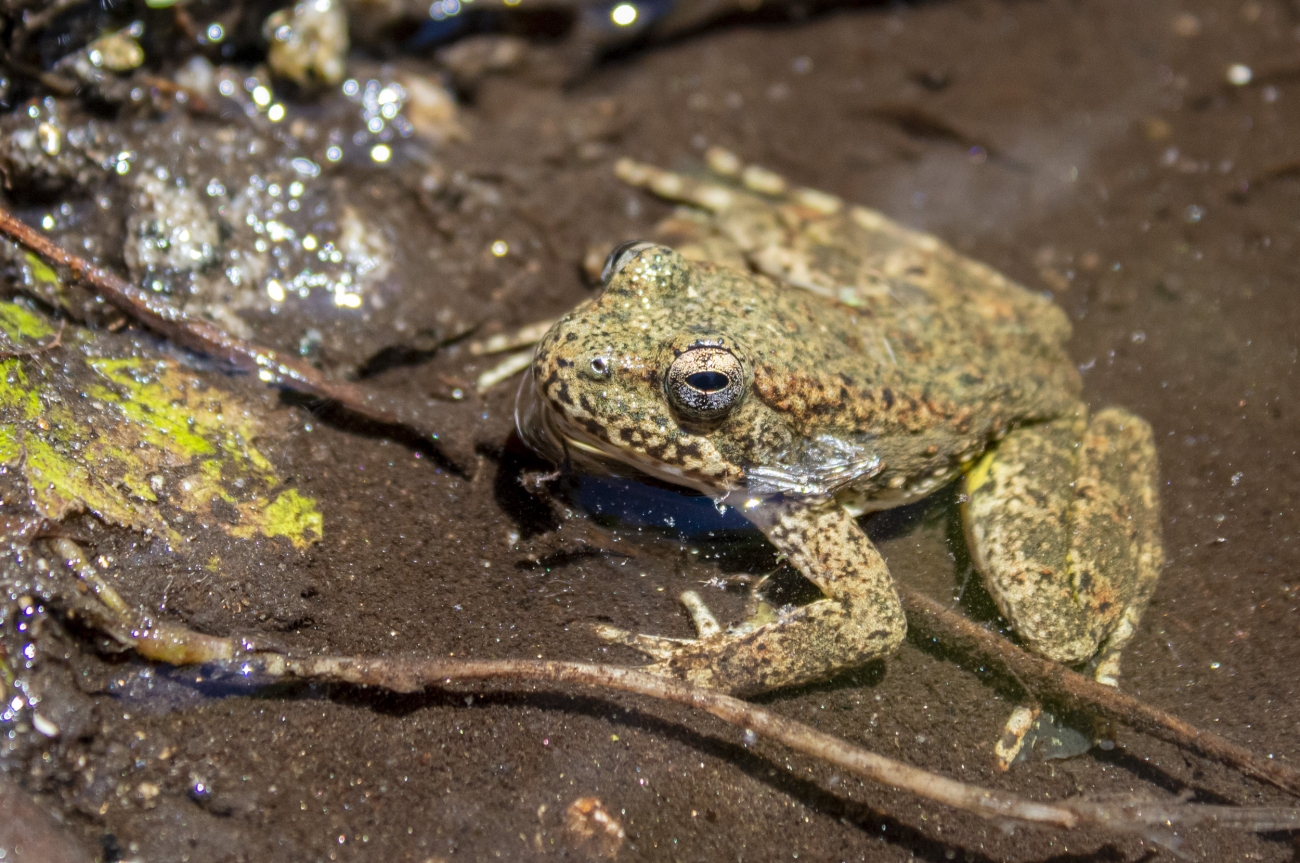 A foothill yellow-legged frog sits in a shallow edge of the Feather River in California.