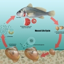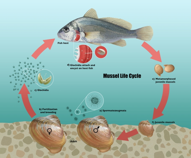 A diagram of the lifecycle for freshwater mussels showing how larva from a fertilized adult female needs to use a host (fish gills) in order to metamorphose or transform into a juvenile adult. Without this parasitic stage juvenile, thus adult mussels would not be created.