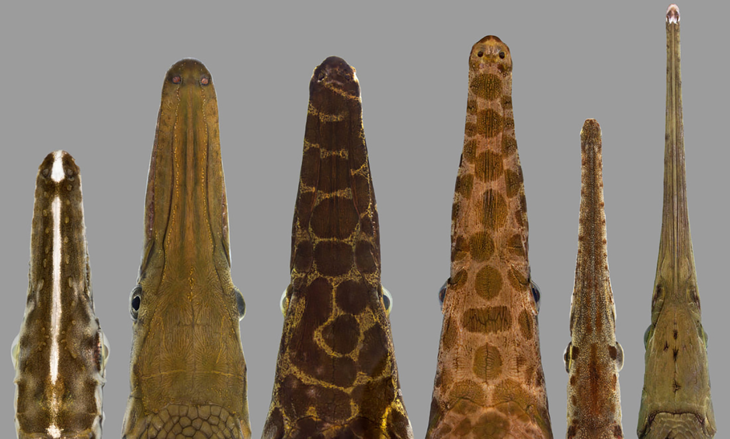 Left to right: alligator, Florida, spotted, and longnose gar from above, with juveniles.