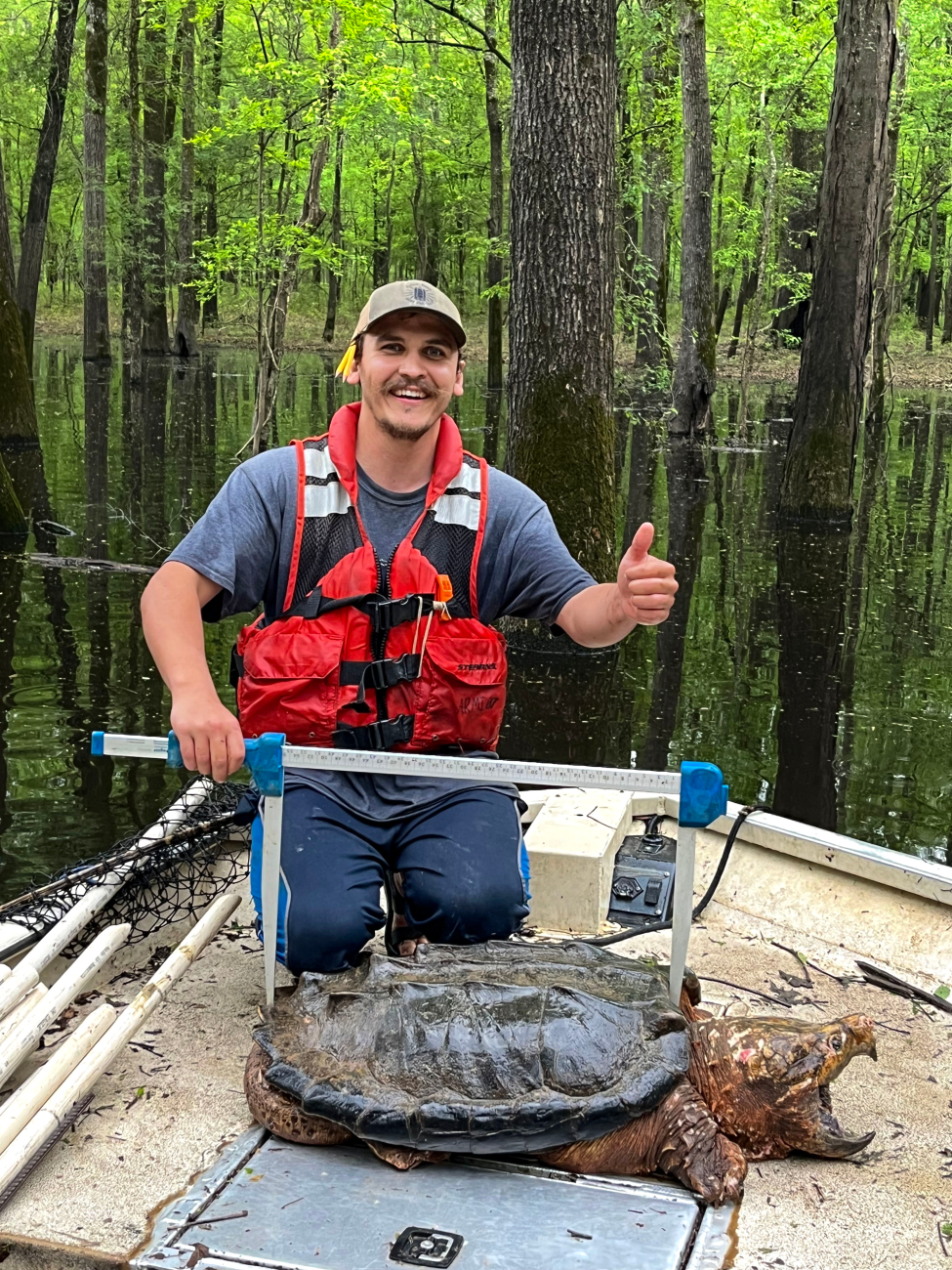Patrick Delisle, a graduate student at the University of Southern Mississippi, poses with an alligator snapping turtle he caught during surveys conducted at the Theodore Rosevelt National Wildlife Refuge, Miss. April 18, 2024. (Photo by Bones Glorioso, United States Geological Survey)