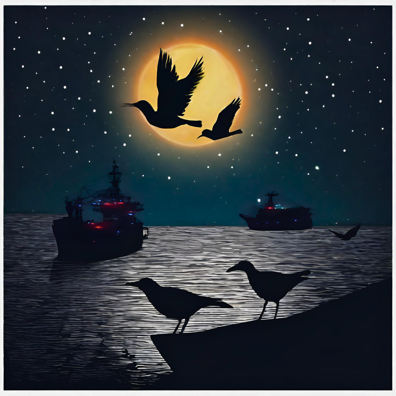 Graphic of offshore vessels with dim lights at night and silhouettes of birds