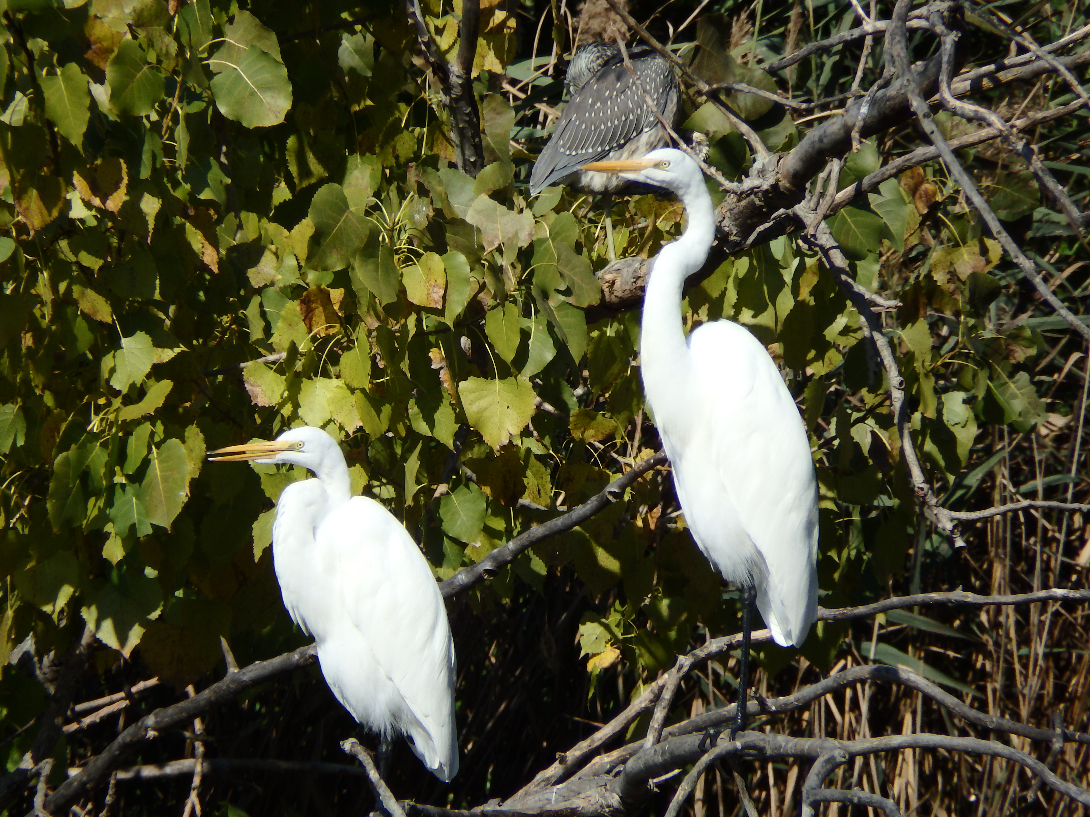 Two great egrets and a juvenile black-crowned night-heron perch on a tree at Great Meadows Marsh.