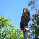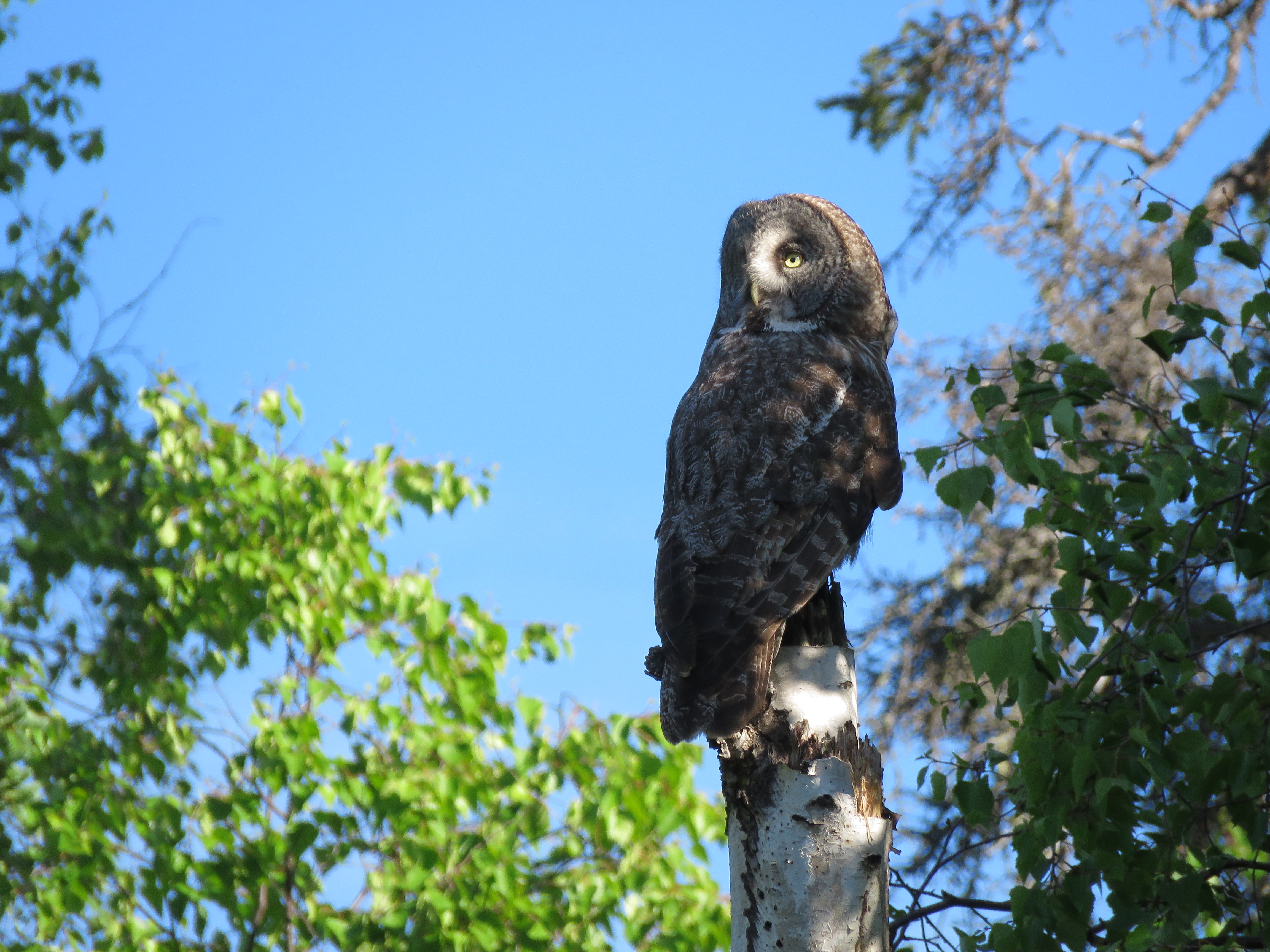 A great gray owl perches on top of a snag in the boreal forest of Kanuti National Wildlife Refuge.