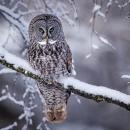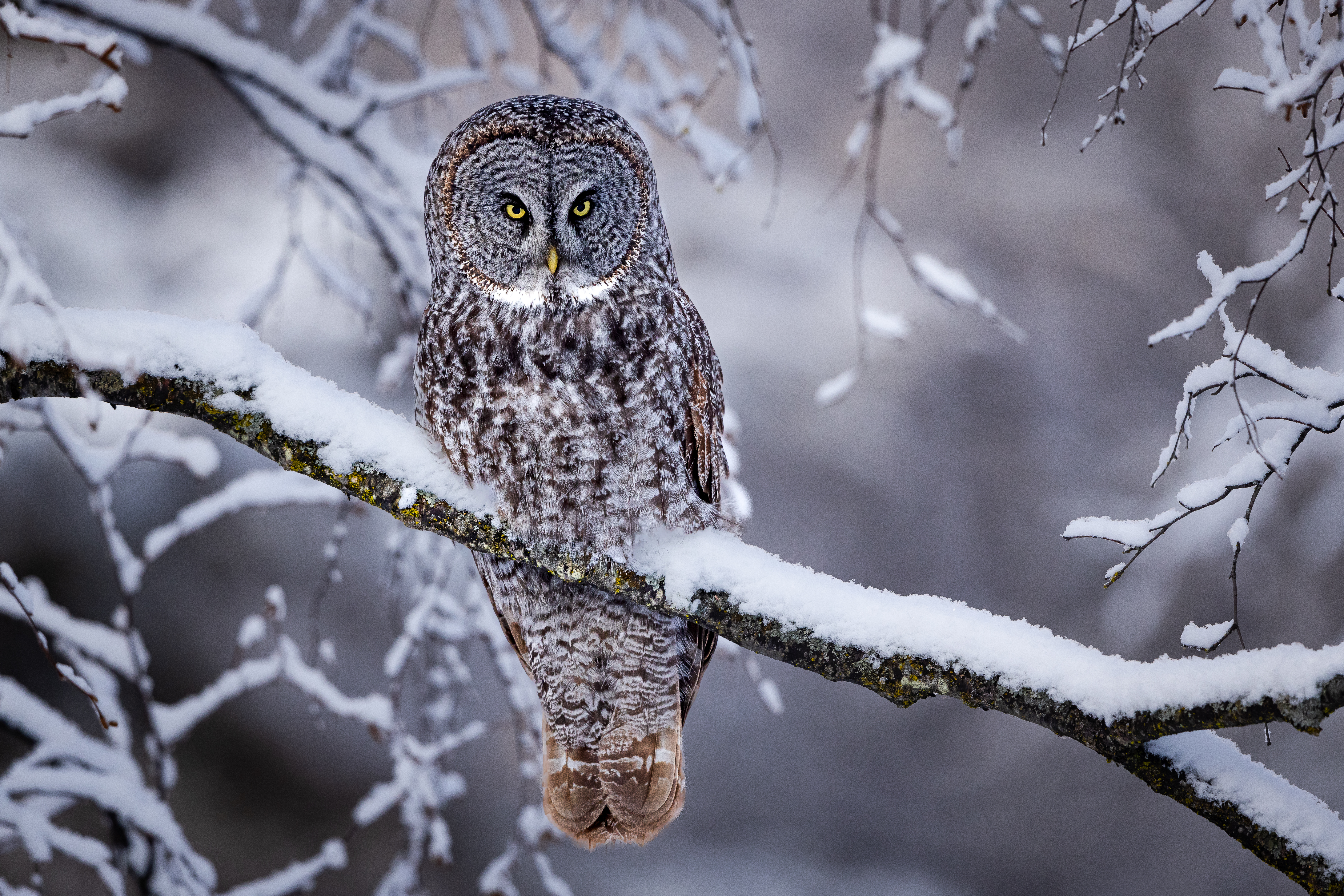 A great gray owl perches in the snowy forest of southcentral Alaska.