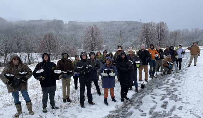 Volunteers pose for a group photo with their trees and shrubs before planting them at the Cherry Valley National Wildlife Refuge Earth Day Celebration and Volunteer Tree Planting Program.