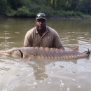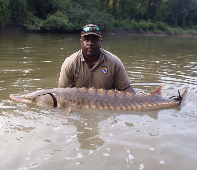 This prehistoric fish reaches lengths of up to nine feet can weigh up to 300 pounds. Biologists tag the threatened Gulf sturgeon to monitor their movements and populations.