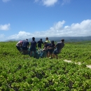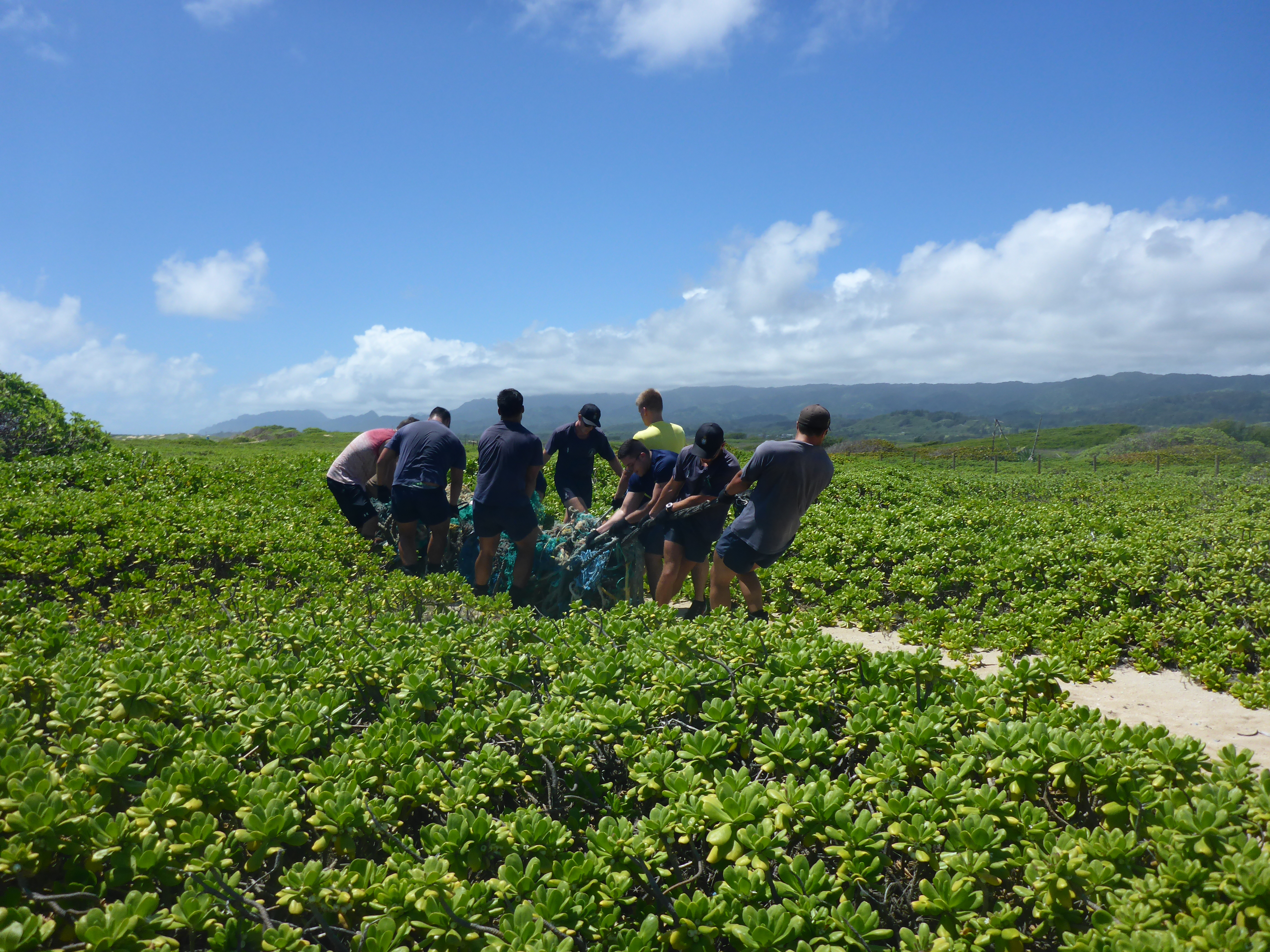 Volunteers from the U.S. and New Zealand Navies haul old fishing nets and debris from the beach at James Campbell National Wildlife Refuge in Hawaii.