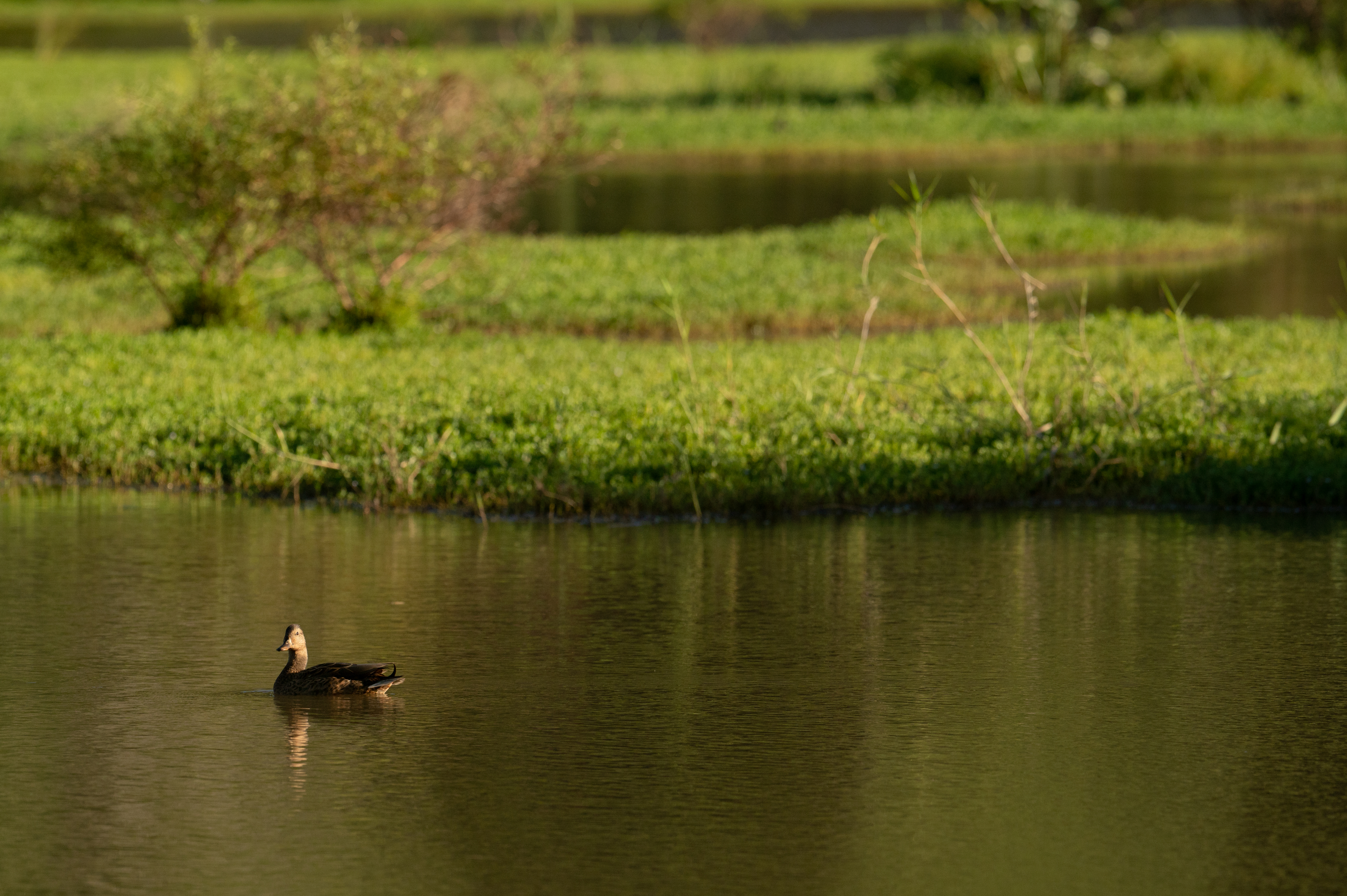 A kaloa maoli (Hawaiin Duck) wades in a protected managed wetland area at Hulē‘ia National Wildlife Refuge.