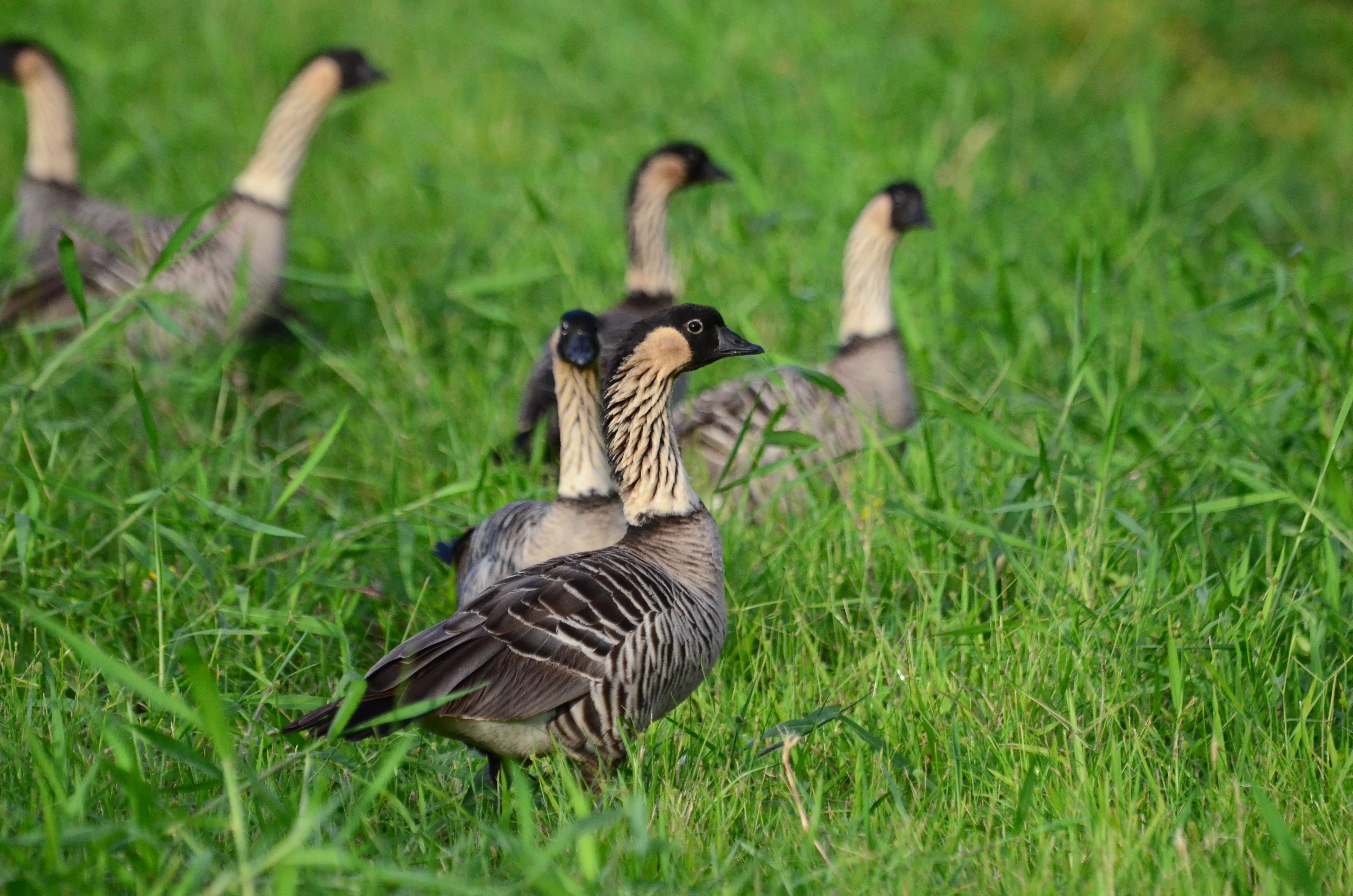 A gaggle of nēnē (Hawaiian geese) hanging out in lush green grass.