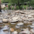 Students in Haywood County, N.C. walk out of the Pigeon River after collecting aquatic invertebrates as part of the 2023 Kids in the Creek educational event.