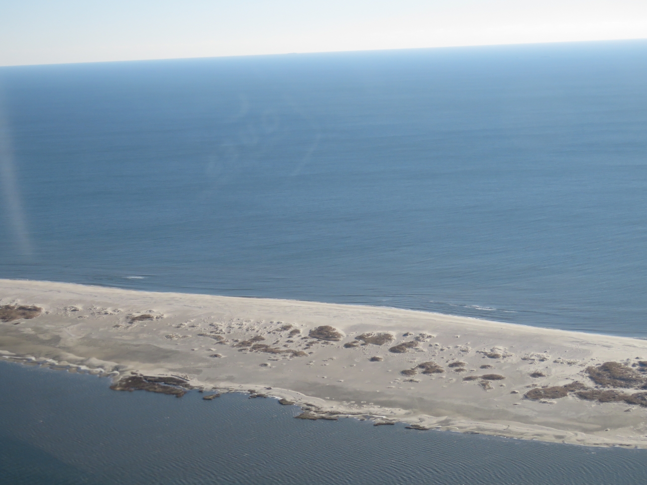 Three aerial photographs of Forsythe’s Holgate beach, taken July 2010, November 2012 (one month after Hurrican Sandy hit), and January 2020, show the progression of vegetation before and following the super storm. The extreme overwash, in picture two, has since settled into a sandy expanse, free of vegetation and primed for plover foraging. (Courtesy of Virginia Rettig)
