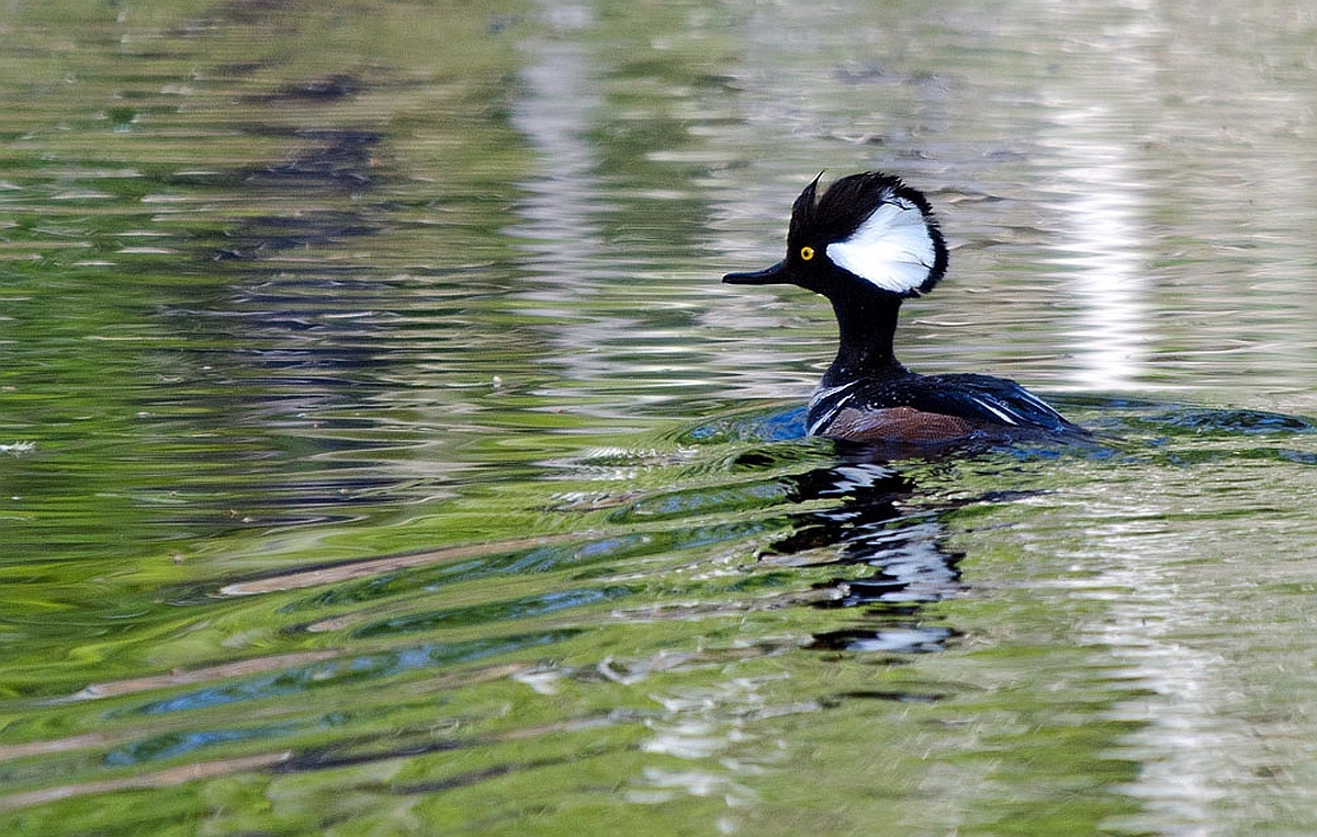 A hooded merganser causes ripples at Great Bay National Wildlife Refuge.