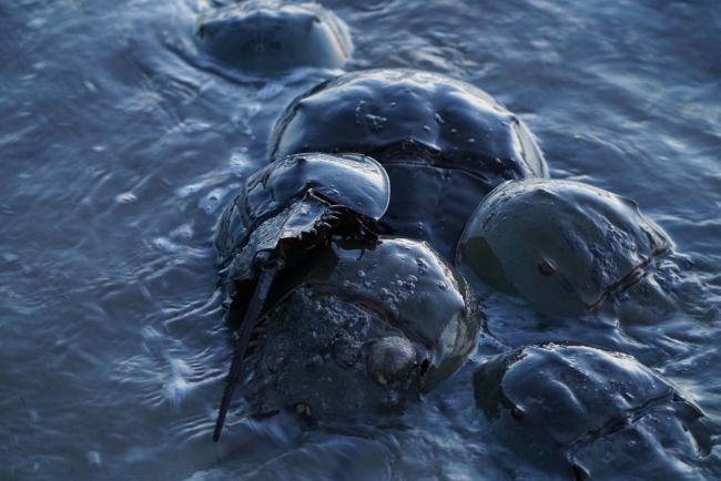 Horseshoe crabs mate in shallow water along the Delaware shore.