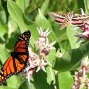 hummingbird moth with monarch on showy milkweed