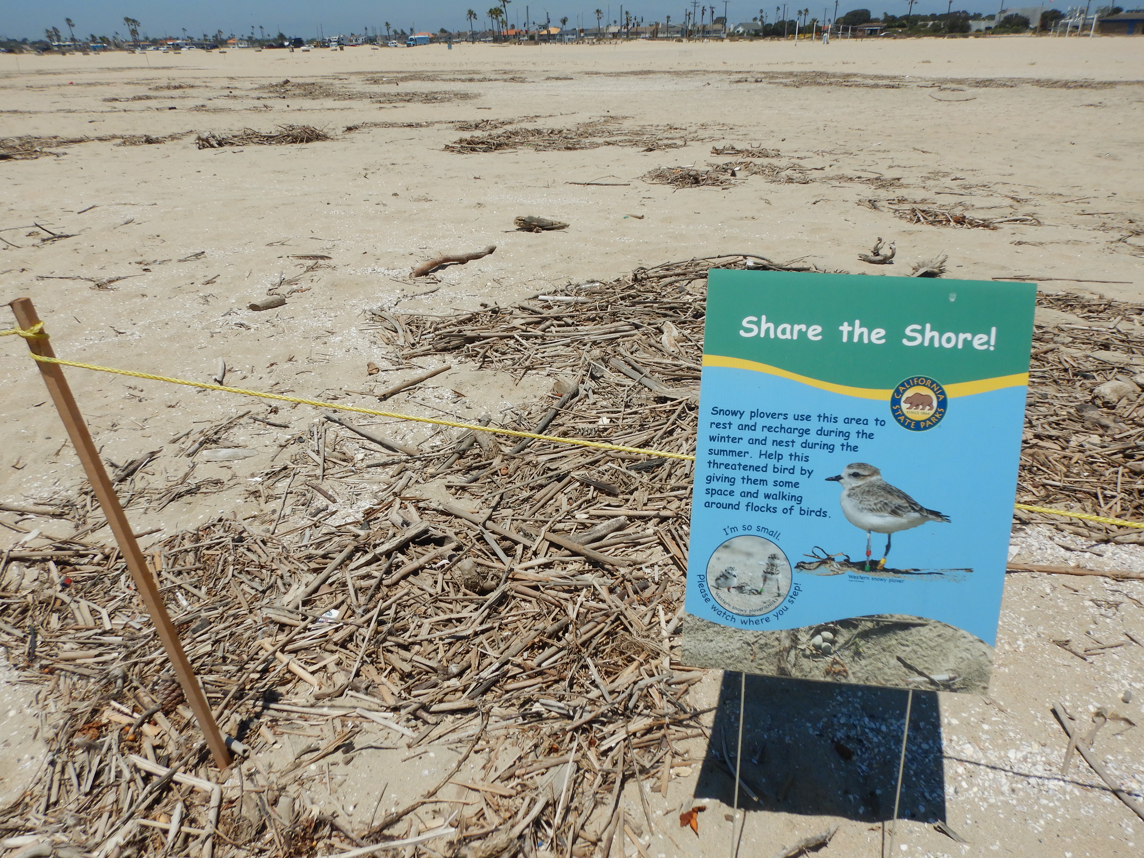 California State Parks sign to educate beachgoers about threatened western snowy plover habitat at Huntington Beach, California.