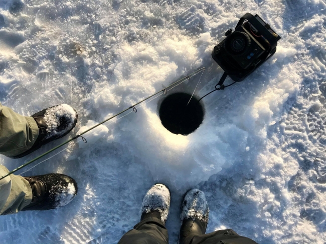 View into the Northern Pike’s winter world. A flasher (upper right) allows anglers to monitor depth and view fish activity in relation to their lure.