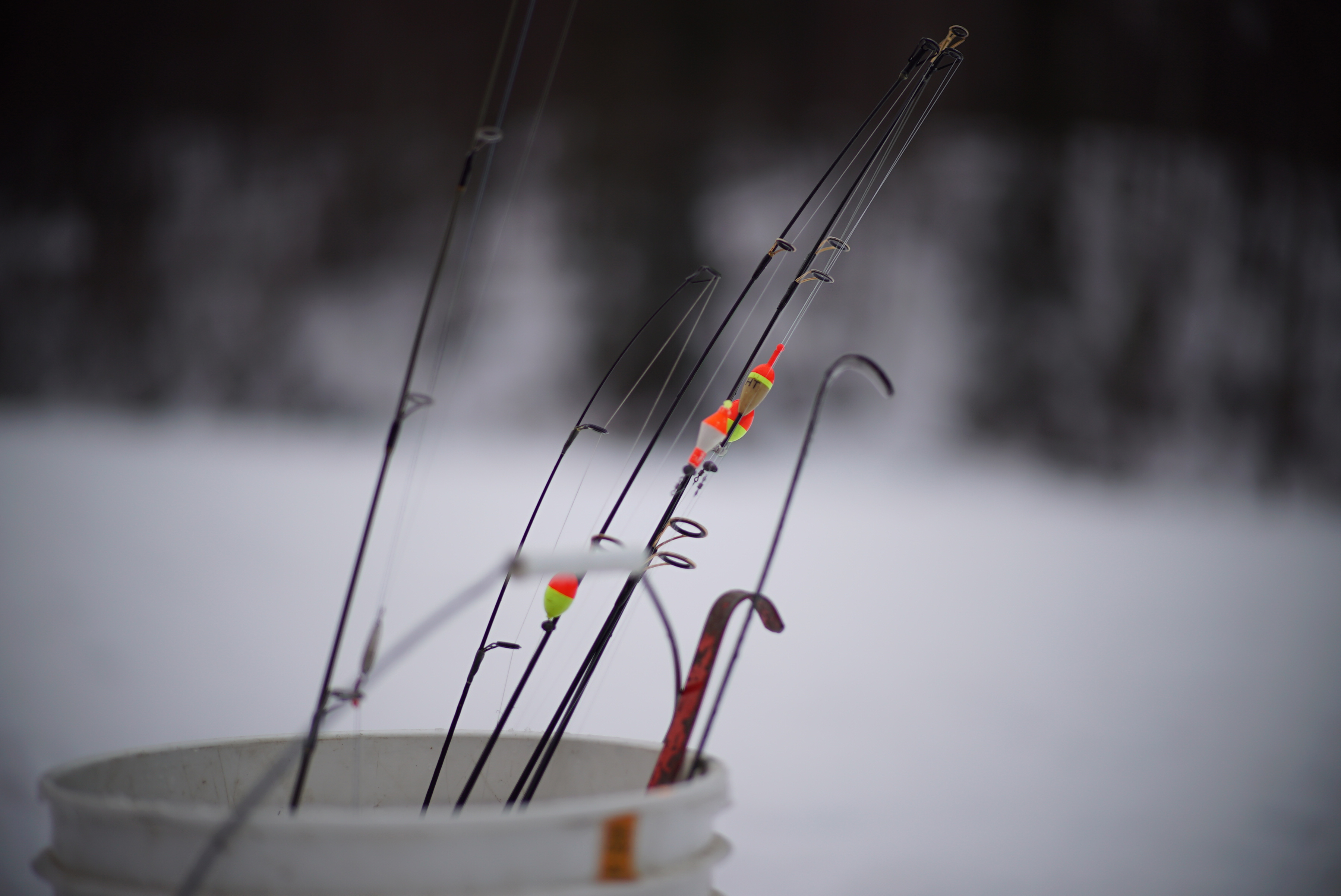 A 5 galon bucket holding ice fishing rods and ice scoopers.