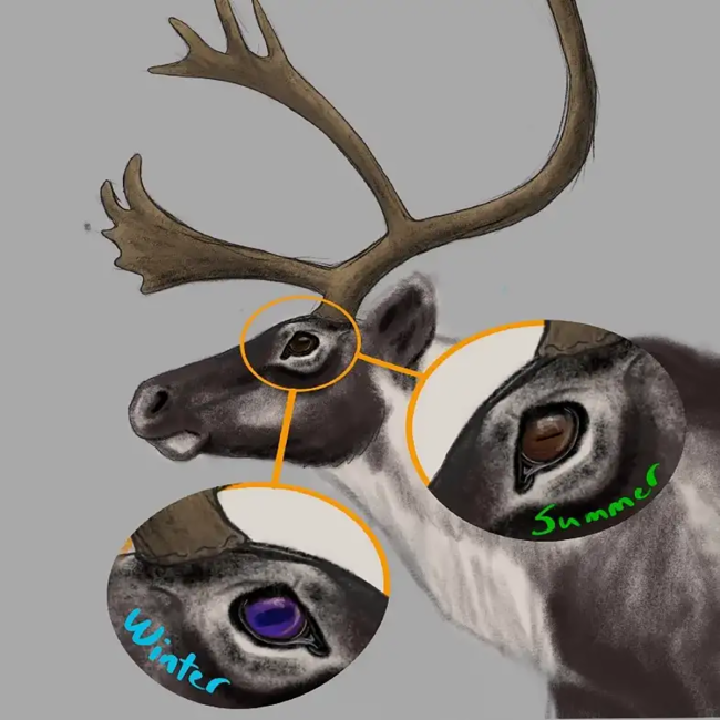A special adaptation for caribou that experience total winter darkness in the very farthest northern regions: a membrane in their eye changes color to reflect different wavelengths of light — summer gold reflects most of the light back out of the eye, while winter blue scatters more light inside the eye, giving the caribou a better chance to spot predators in the dark. Art by Christina Nelson/USFWS.