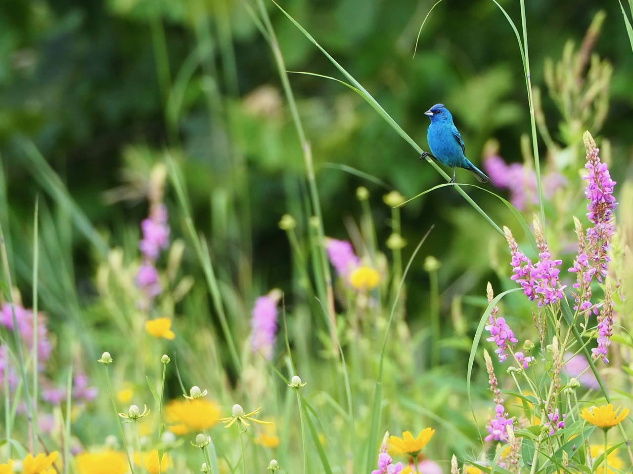 An indigo bunting sits in a meadow in Detroit, Michigan. Since 2017, Detroit Bird Alliance, the City of Detroit, U.S. Fish and Wildlife Service, Detroit Zoological Society, Urban Neighborhood Initiatives, and many other community organizations, have been undertaking the Detroit Bird City project supported by the Urban Bird Treaty program and the National Fish and Wildlife Foundation’s 5 Star and Urban Waters Restoration Grant program. Together Detroit partners—in collaboration with the community—are transforming underutilized parks into beautiful community greenspaces with meadow habitat, providing a haven for birds, insect pollinators, and visitors alike.