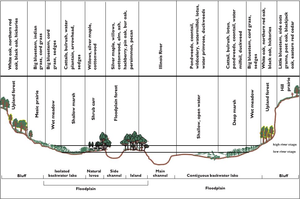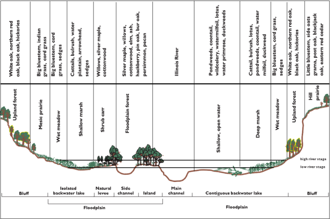 Hypothetical floodplain cross section illustrating the different habitat types likely to have occurred on the Illinois River prior to large scale human development.