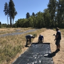 Mid Columbia Fisheries restoration crew installing landscape fabric to prevent weeds from overtaking the plants that will be installed.