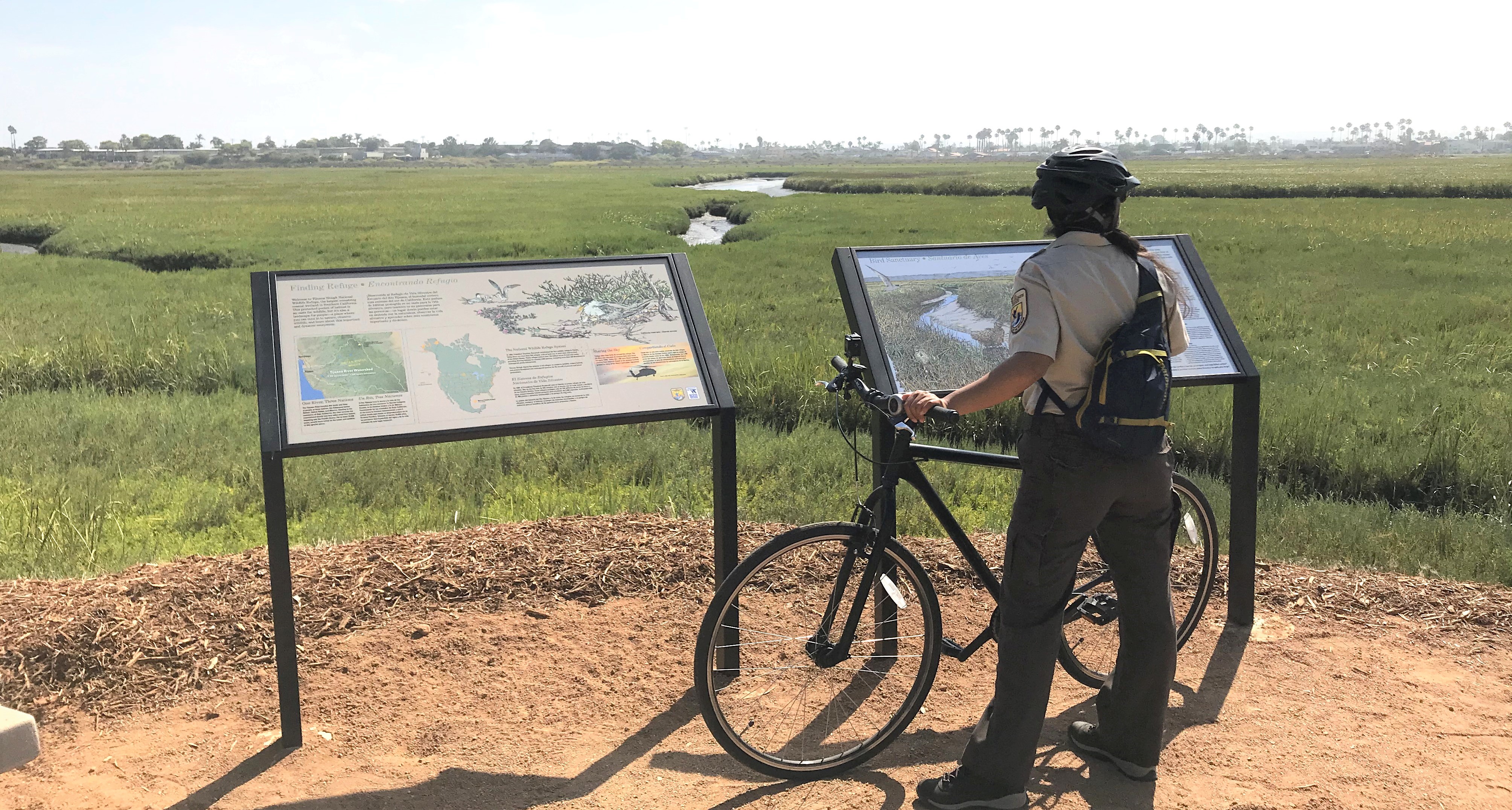 A U.S. Fish and Wildlife Service employee looks at interpretive panels at Tijuana Slough National Wildlife Refuge, just north of the Mexican border south of San Diego, California. Date: May 28, 2021.