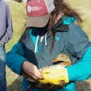 Kelly Kaye, American Conservation Experience (ACE) Easement Mapping Intern banding a recently captured wild Mallard duck.