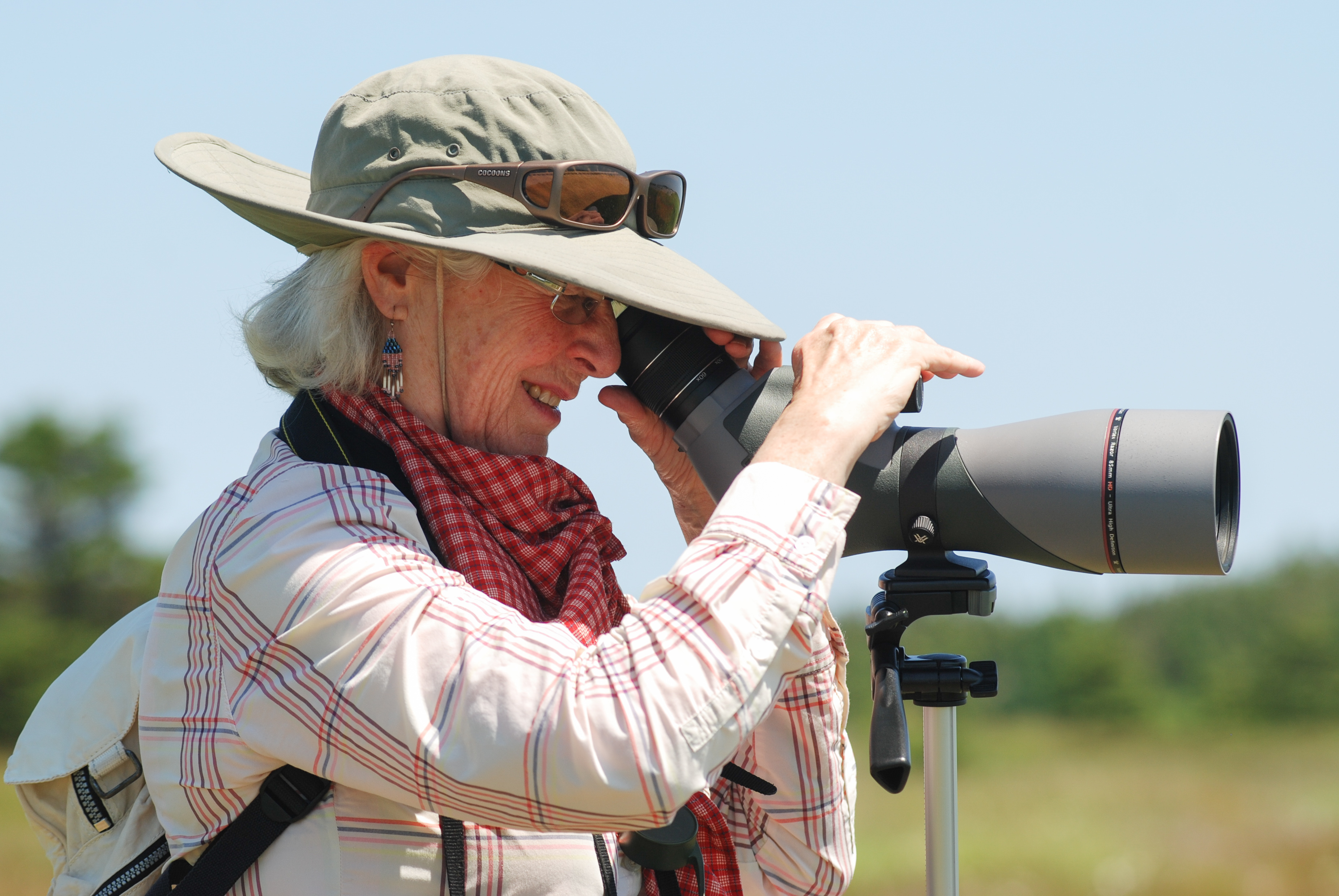 Actress and conservation champion Jane Alexander looks through a spotting scope as she monitors piping plovers in Nova Scotia.