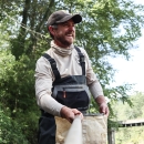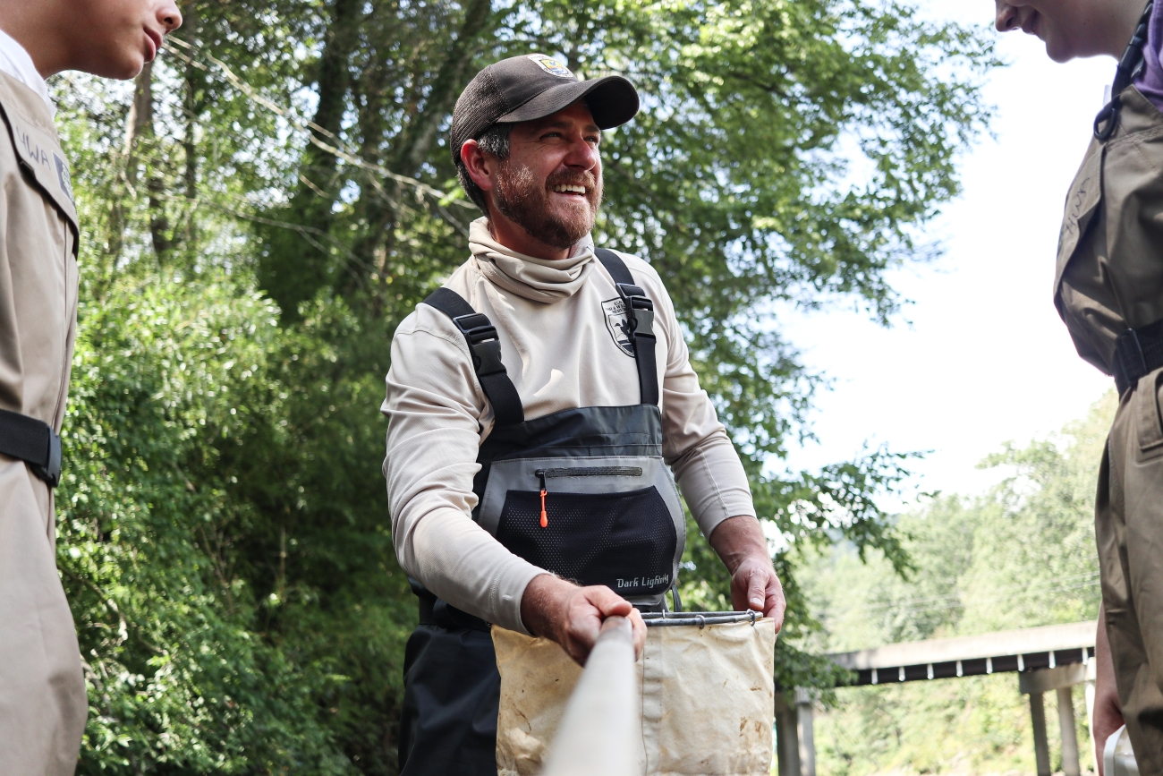 Jeff Quast chats with students while collecting aquatic invertebrates as part of the 2023 Haywood County, N.C. Kids in the Creek event.