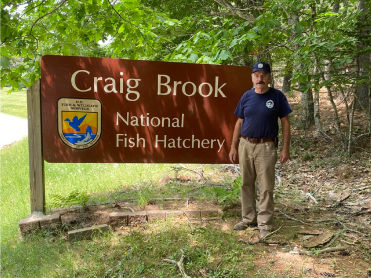 Volunteer Joe Archaimbault stands next to a sign at Craig Brook National Fish Hatchery.