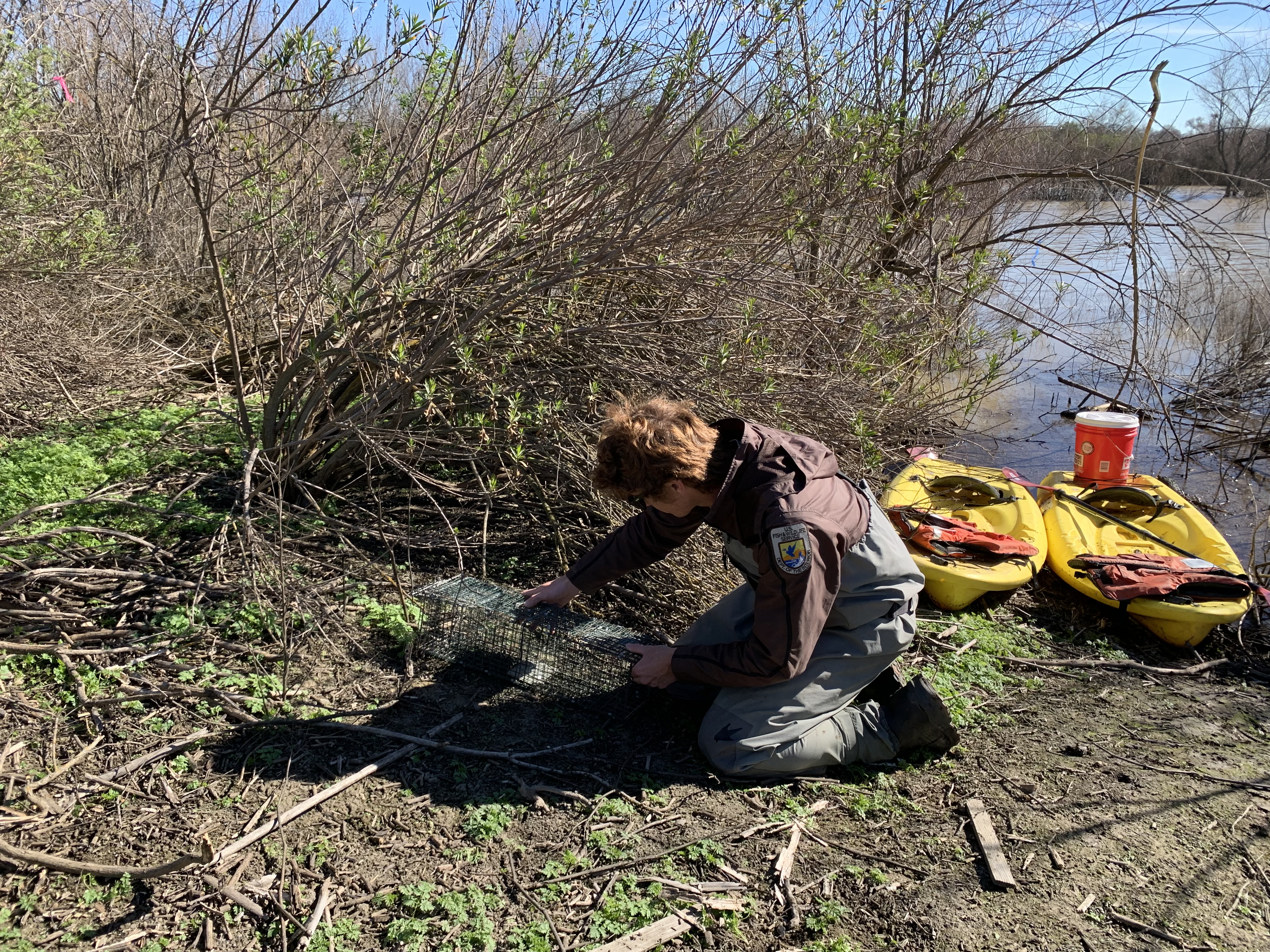 Refuge biologist Josh Hengel sets a rabbit trap as part of flood rescue efforts. The flooded rescue sites required watercrafts to reach.