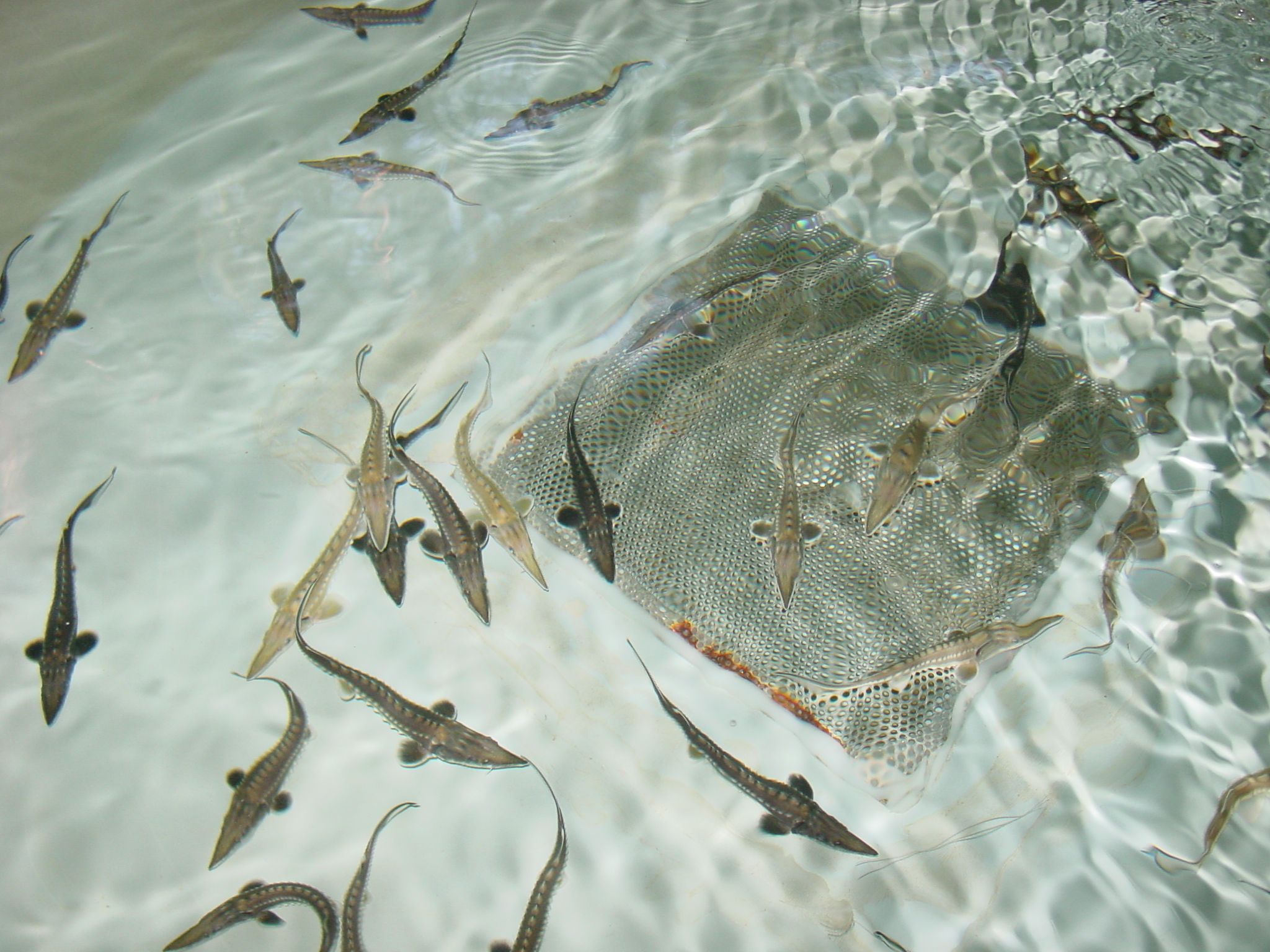 5 month old juvenile Atlantic sturgeon swimming in a tank at Bears Bluff National Fish Hatchery.
