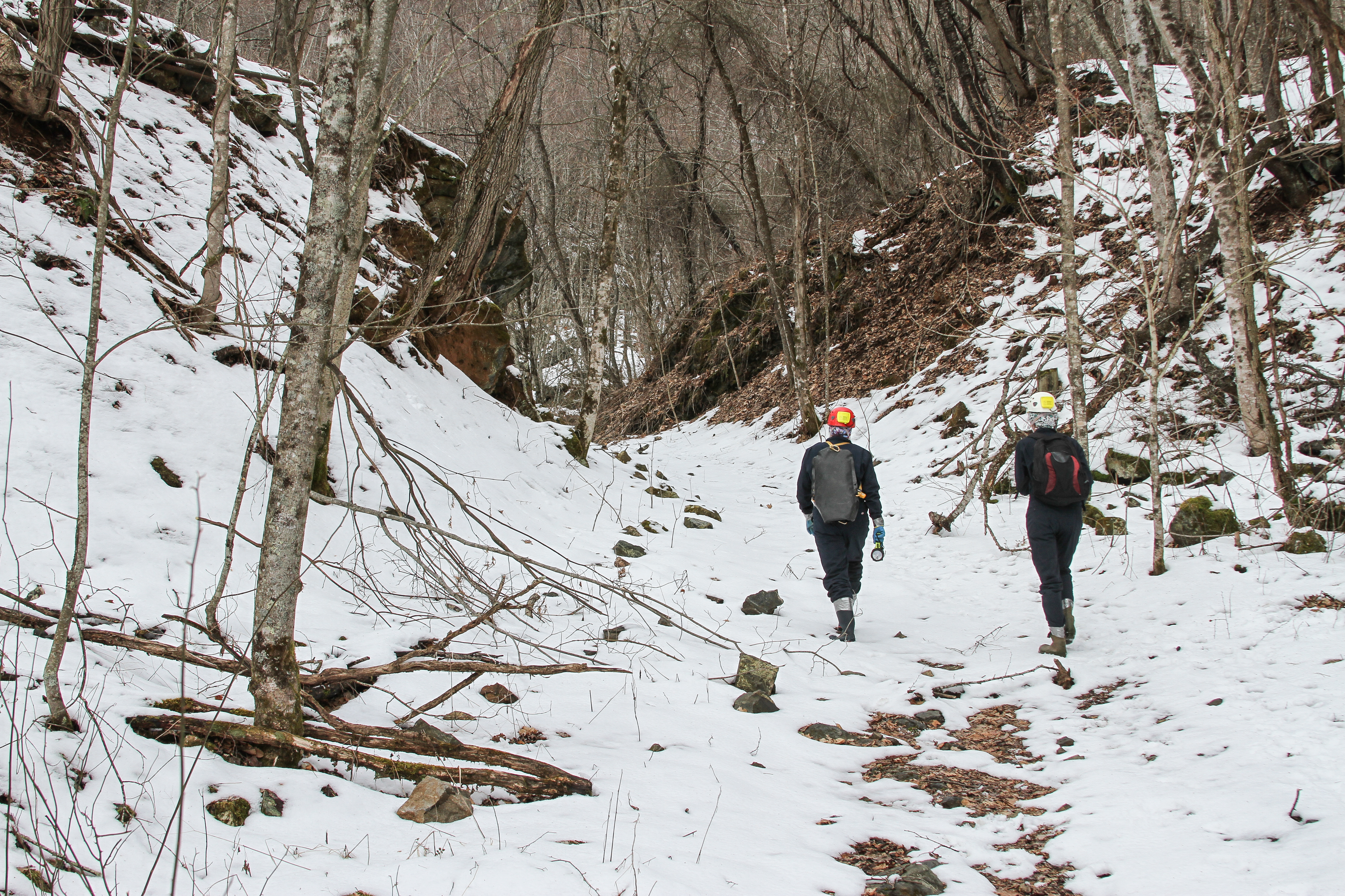 Katherine Etchison (L) of the N.C. Wildlife Resources Commission, and Service biologist Sue Cameron hike to an abandoned western North Carolina iron mine, as part of a team conducting a biannual bat survey of the mine.