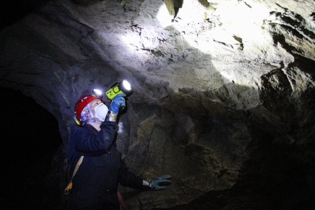 N.C. Wildlife Resources Commission biologist Katherine Etchison searches the walls of an abandoned iron mine for bats, as part of a biannual bat survey of the mine.
