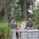 Ken Gates (left) and Jim Boersma at the Funny River weir in Kenai National Wildlife Refuge, Alaska.