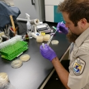 La Crosse Fish Health Center staff wiping fish sample to test for presence of bacteria by USFWS