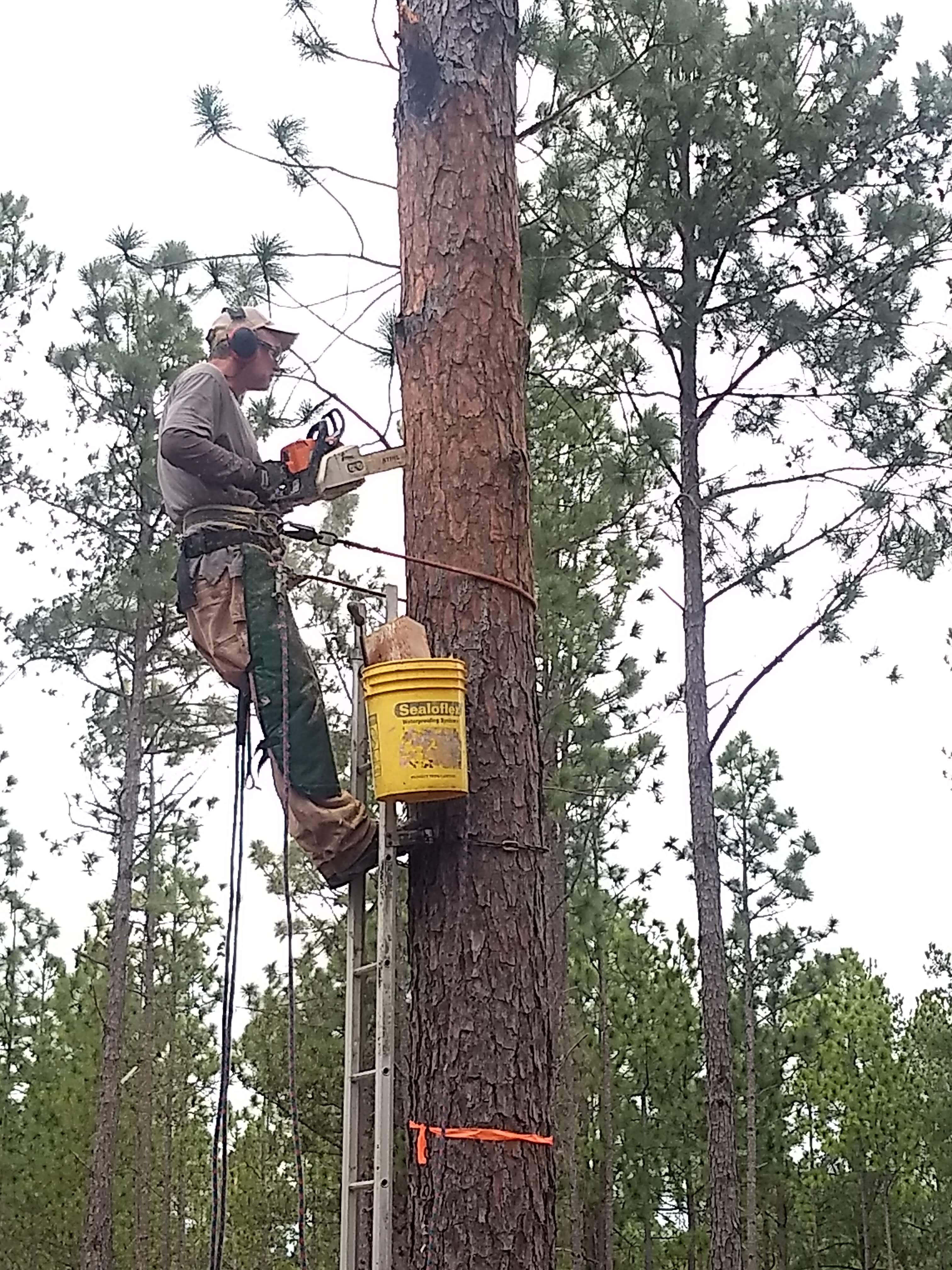 Larry Wood, Wildlife Investigations LLC, installs a woodpecker cavity.