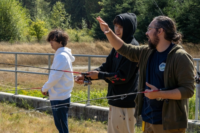Bureau of Indian Affairs intern Chris Lage gives casting tips to two members of the Lower Elwha Klallam Tribe.