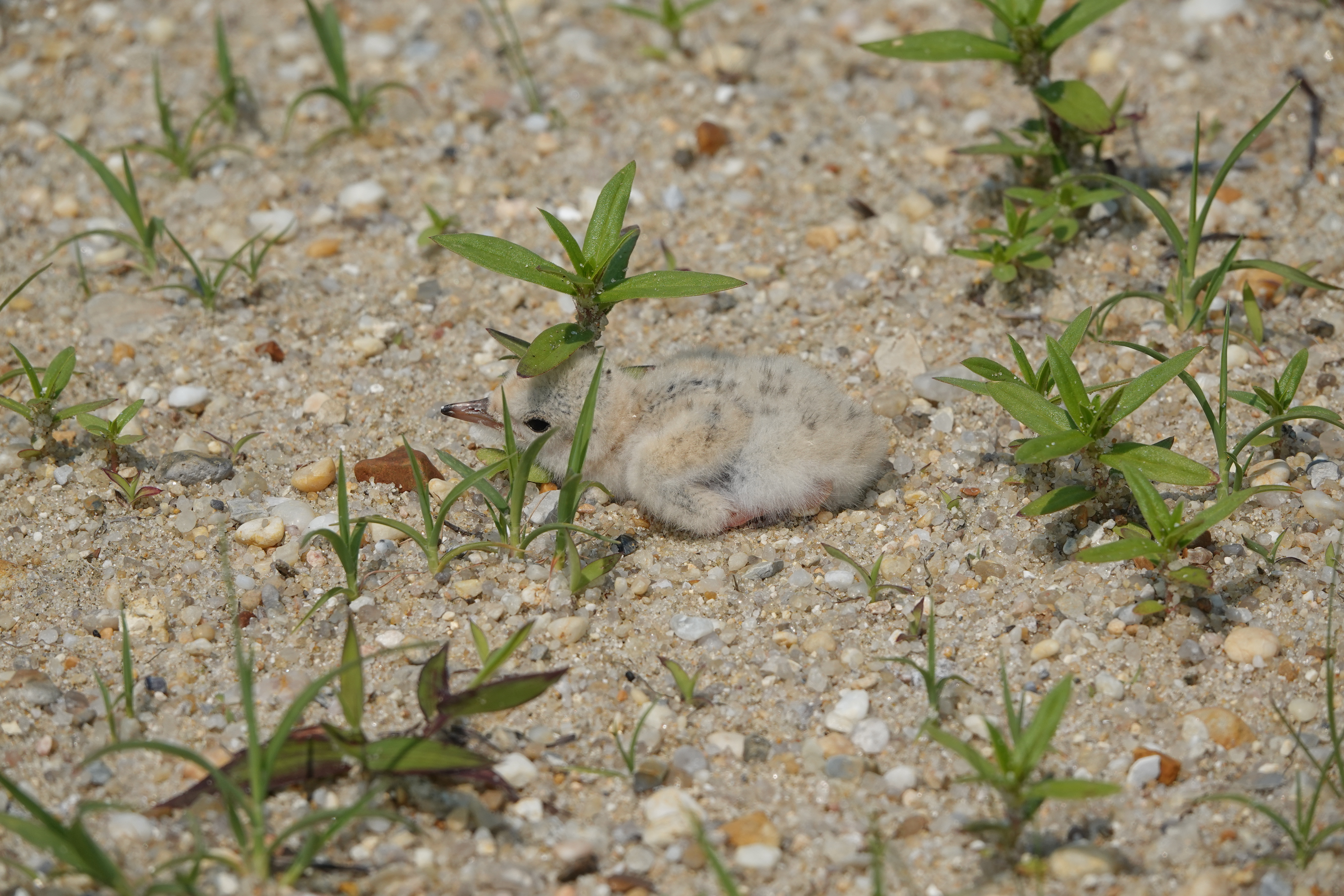 A small fluffy tan and white chick lays tucked up next to a small green plant on a sand and gravel beach. Other small plants are scattered throughout the image.