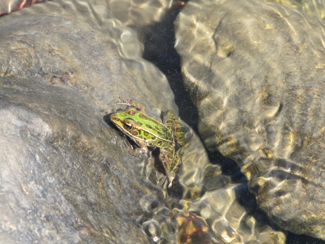A leopard frog peers out of Lake Huron at Harbor Island National Wildlife Refuge in Michigan.