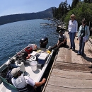 Lisa Heki, (center) Lahontan National Fish Hatchery Complex manager, describes to a reporter how the staff stocked more than 8,000 Lahontan cutthroat trout in Fallen Leaf Lake, California in this archive photo from September 10, 2010. Credit: Jon Myatt/USFWS