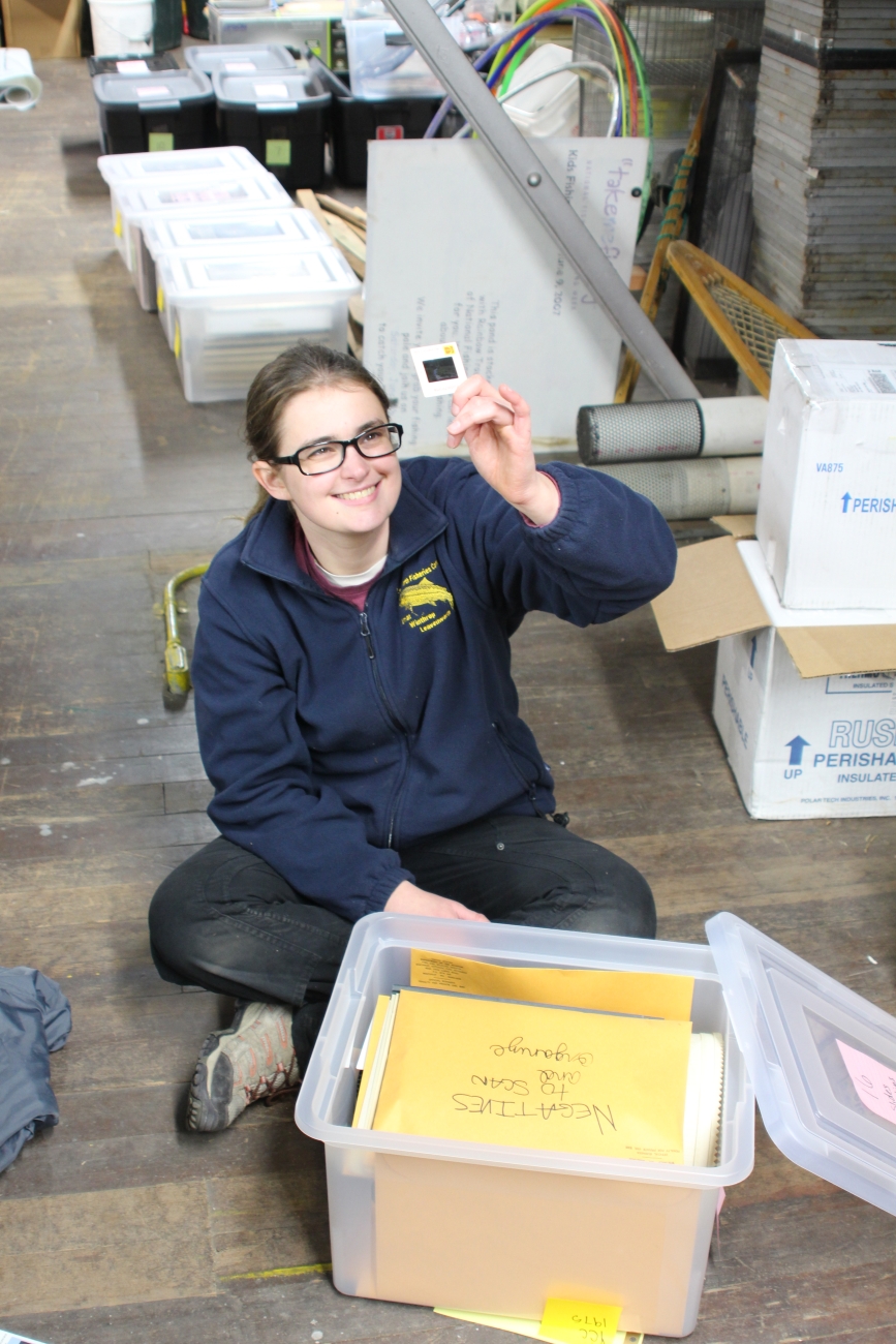 American Conservation Experience intern Emily Richardson examines a slide found in the collection at Winthrop National Fish Hatchery.