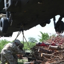 The Louisiana Army National Guard’s ground crew attaches the harnessed bundle of trees to the bottom of the helicopter.